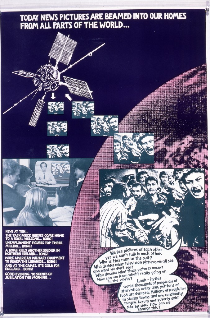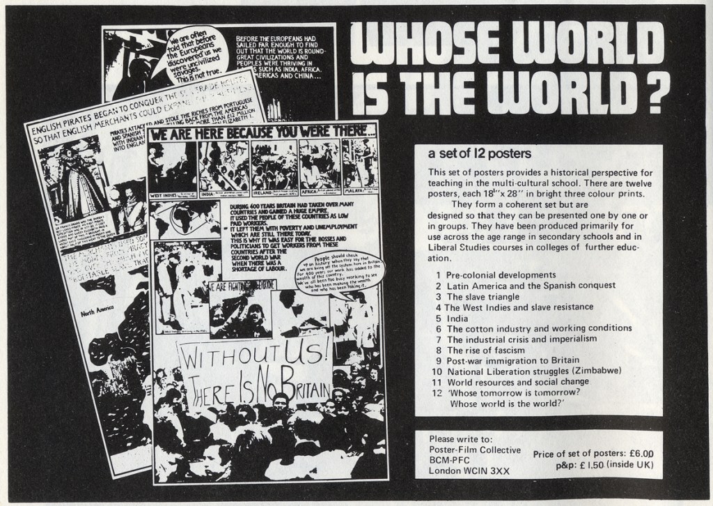 SYNOPSIS: In attempting to develop a political poster culture in Britain the Poster Film Collective, whilst still creating single image/text relations in posters, recognised the limitations of this form, and tried to develop a new form more akin to ‘wall newspapers’. By 1979 when “Whose World is the World?” was produced they had already made several series of posters designed to work in relationship to each other and to carry quite complex information or ideas. This poster set was made primarily for use in secondary schools. It attempted to provide a historical perspective for teaching in multicultural schools, showing the links between the question of racism and the worldwide development of Western economic power. Unlike other ‘exhibition’ forms poster sets could be mass-produced and sold cheaply. This set has been used widely in schools and colleges throughout the country.