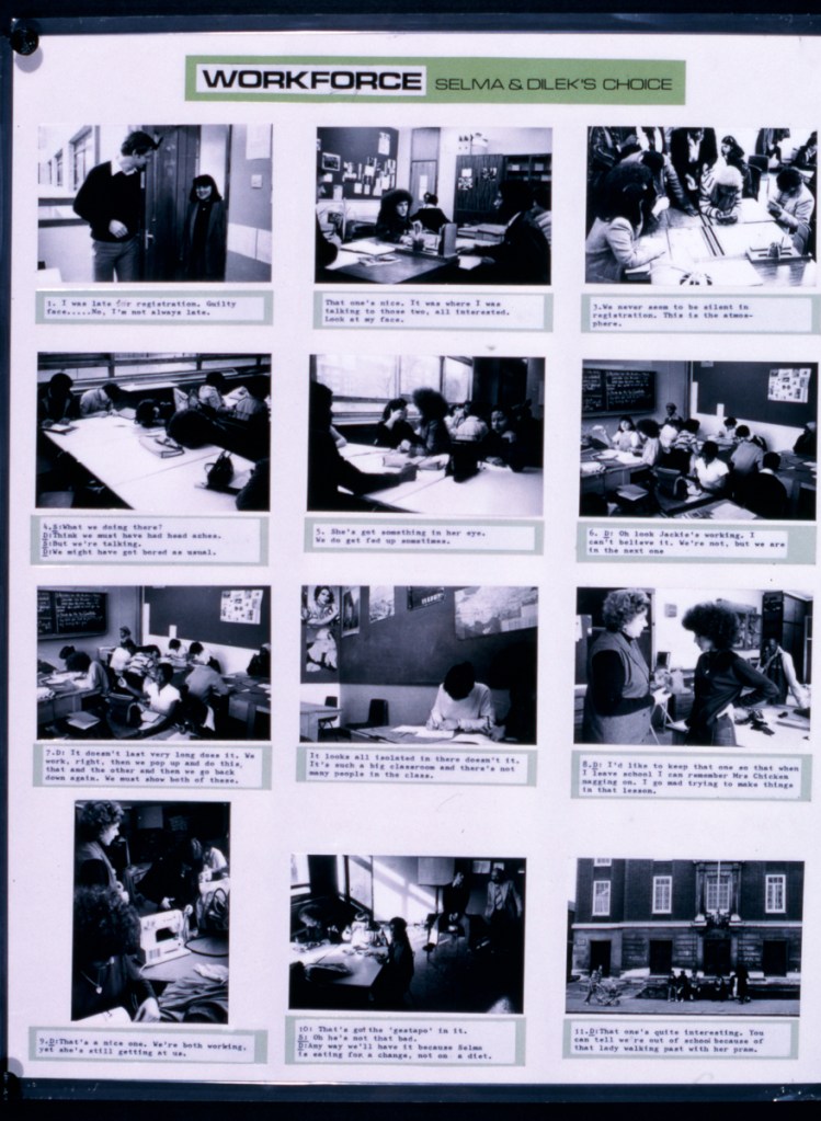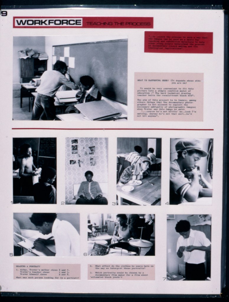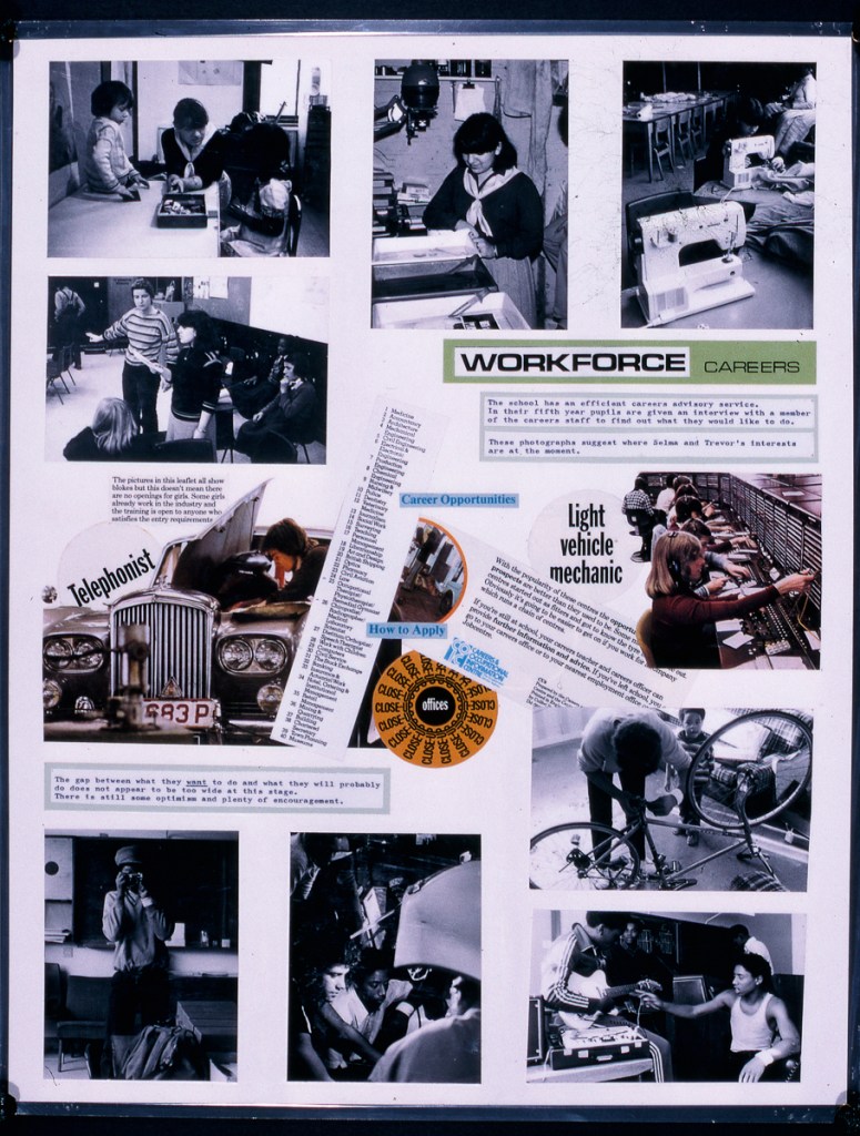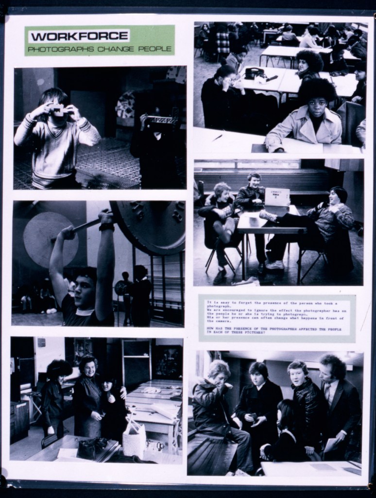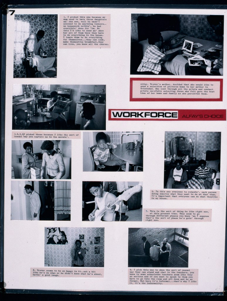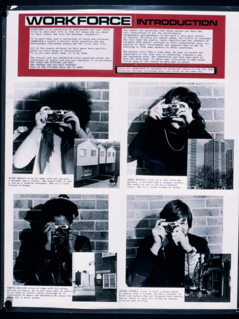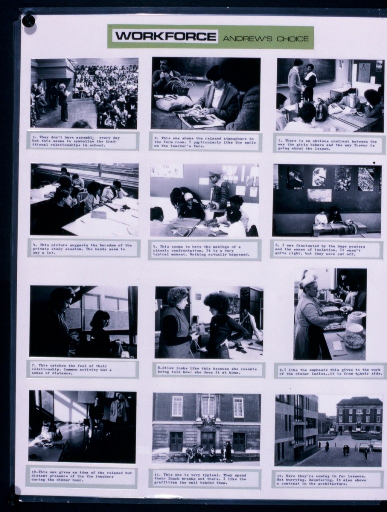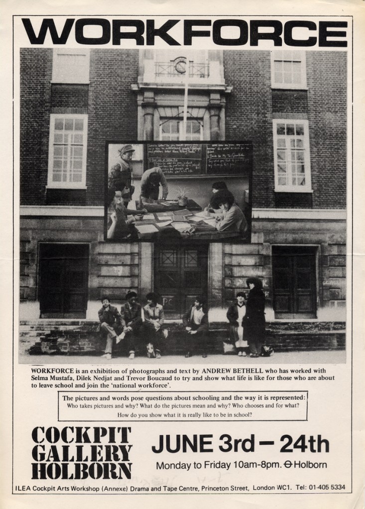 This is an exhibition of photographs and text by Andrew Bethall, which tries to show what life is like for those who are about to leave school and join the ‘national workforce’. It is more than just a collection of words and pictures. “Workforce” is about a project which questions the way photography represents people and the lives they live. The emphasis of the project is on participation and demystification. The project and the exhibition raise questions about the experience of school and how you represent it; who takes pictures and why?… who chooses and for what purpose… what do pictures mean and to whom?… The exhibition records part of the experience of the last year of schooling, finding a job and beginning work, and the issues raised. “Workforce” is intended to encourage others to ask the same questions by recording their own lives in the same way.
