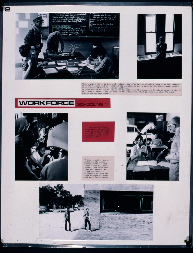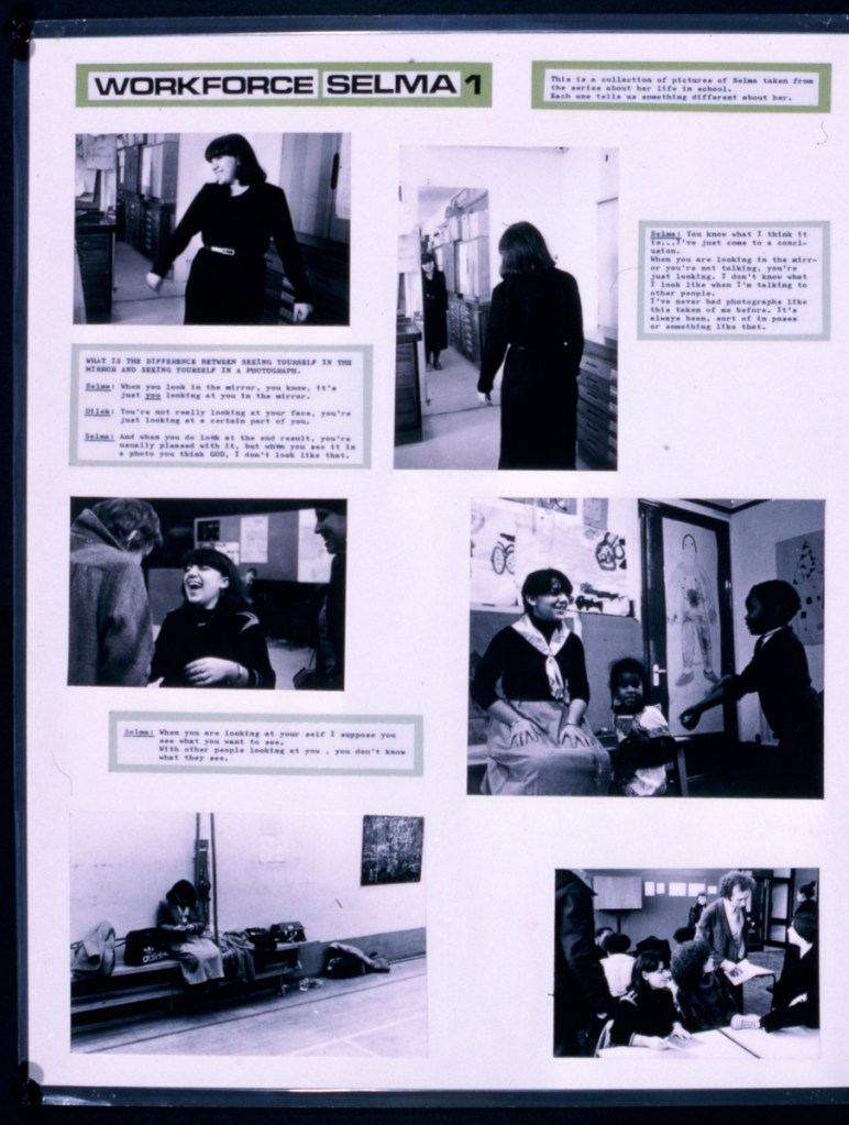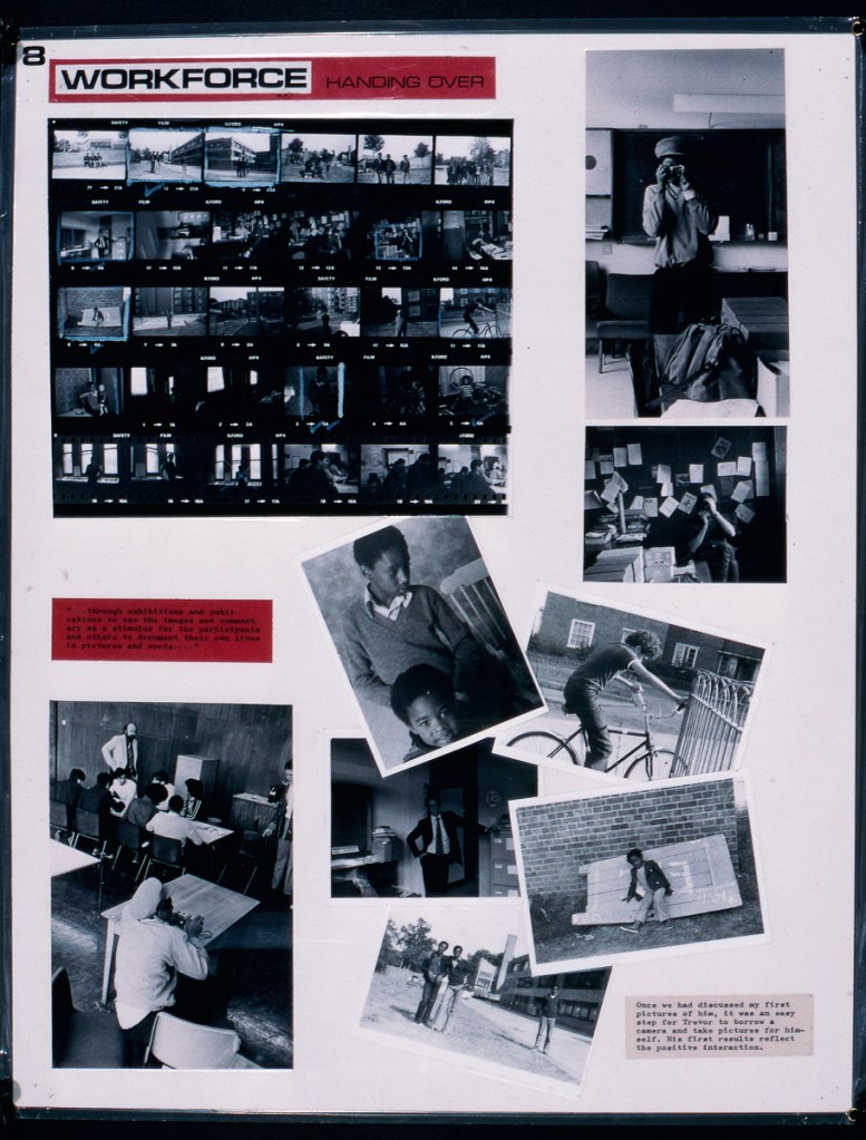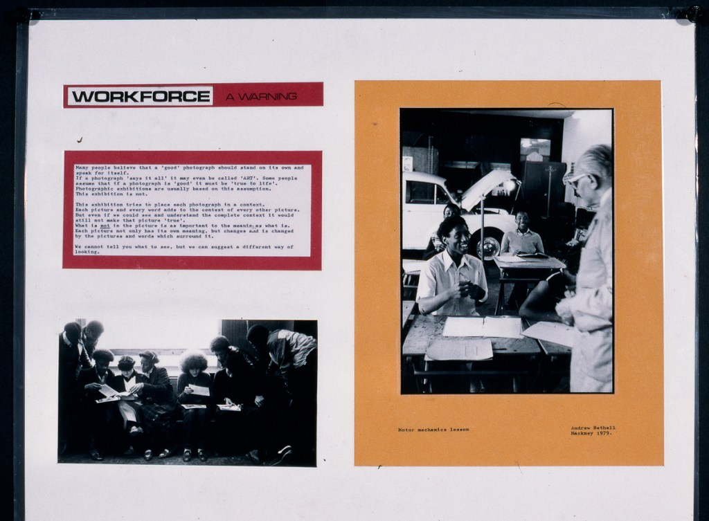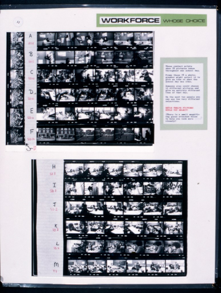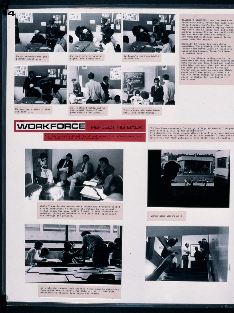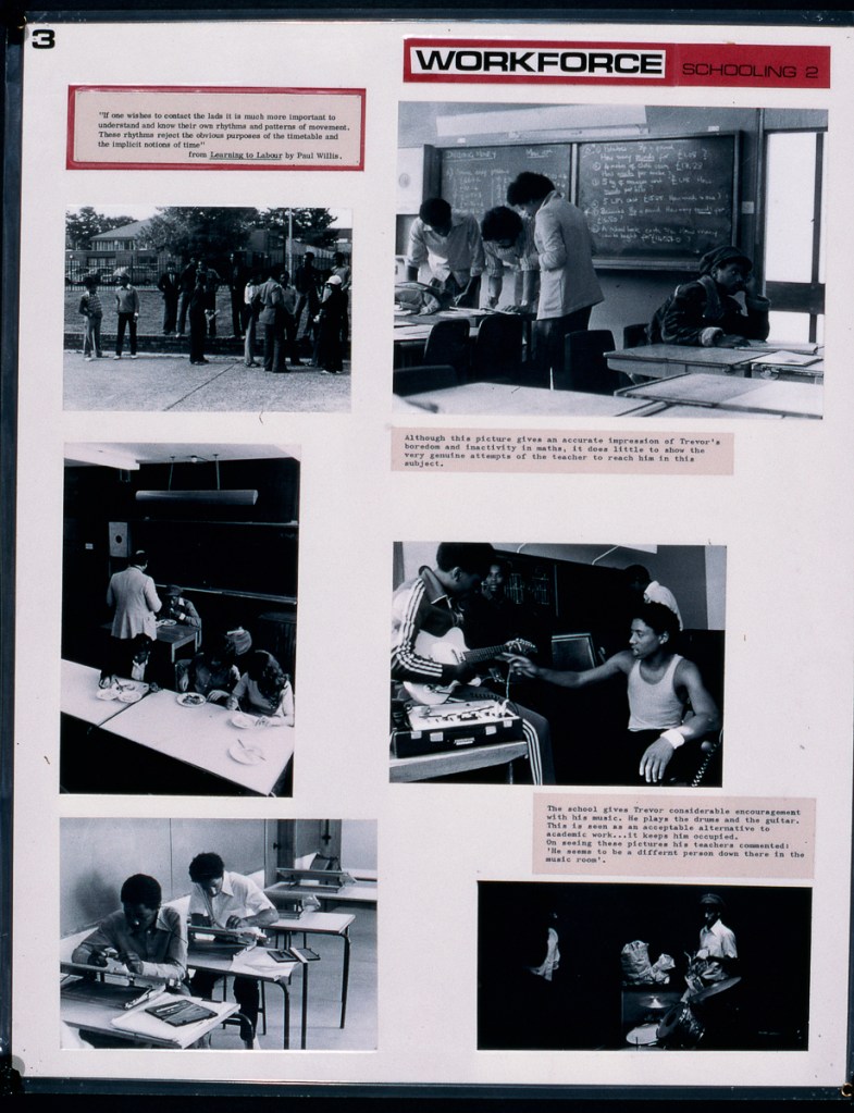 This is an exhibition of photographs and text by Andrew Bethall, which tries to show what life is like for those who are about to leave school and join the ‘national workforce’. It is more than just a collection of words and pictures. “Workforce” is about a project which questions the way photography represents people and the lives they live. The emphasis of the project is on participation and demystification. The project and the exhibition raise questions about the experience of school and how you represent it; who takes pictures and why?… who chooses and for what purpose… what do pictures mean and to whom?… The exhibition records part of the experience of the last year of schooling, finding a job and beginning work, and the issues raised. “Workforce” is intended to encourage others to ask the same questions by recording their own lives in the same way.